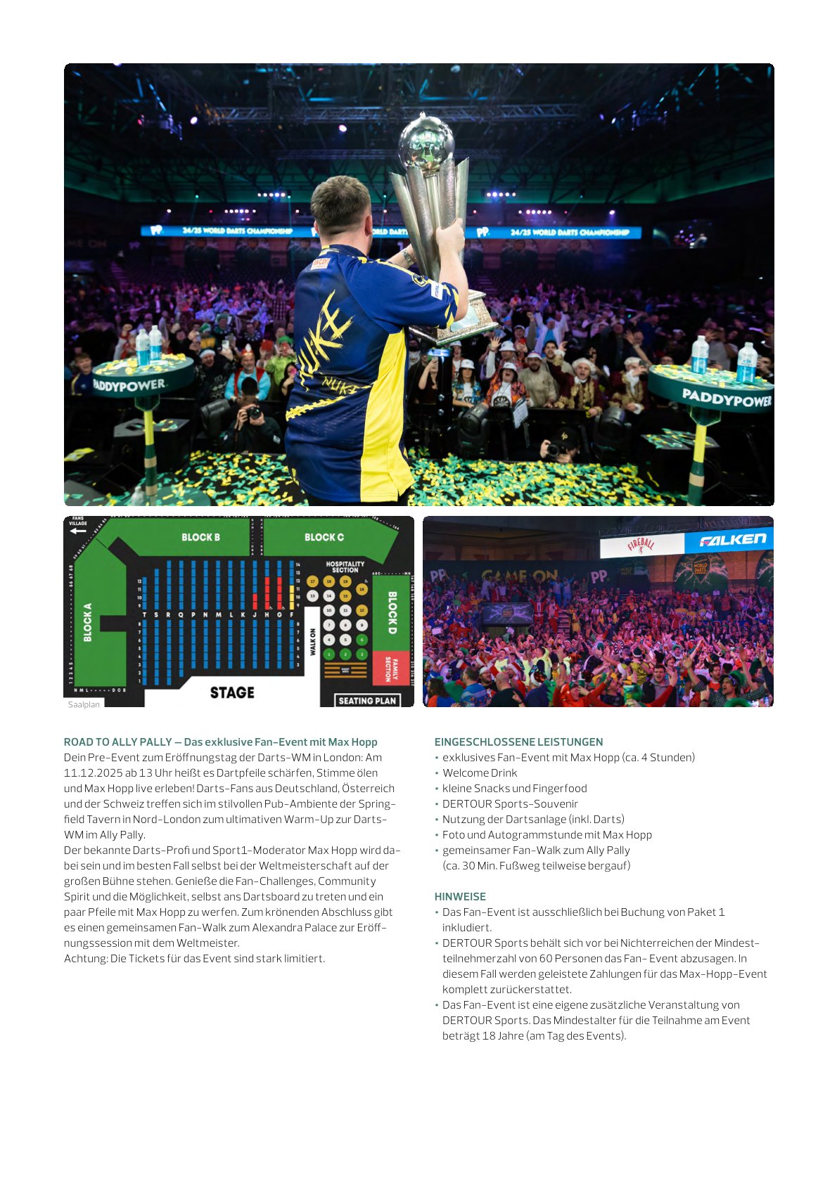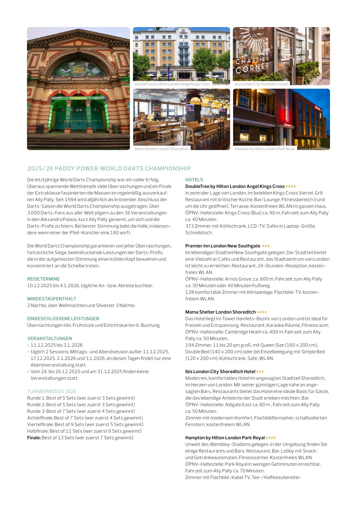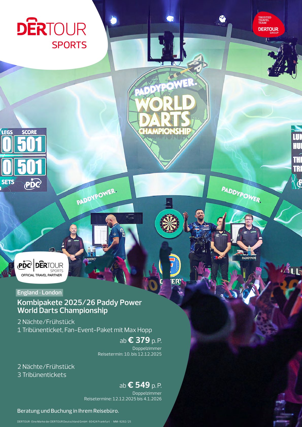 "Ally Pally" (Alexandra Palace) statt. Die Besten der Besten treten gegeneinander an und bringen die Halle zum toben. Darts Fans aus der ganzen Welt lassen sich dieses Spektakel nicht entgehen. Es ist der krönende Abschluss der Darts-Saison und bei bester Stimmung bebt die Halle bei jedem Spiel, besonders wenn die Könner eine 180 werfen.