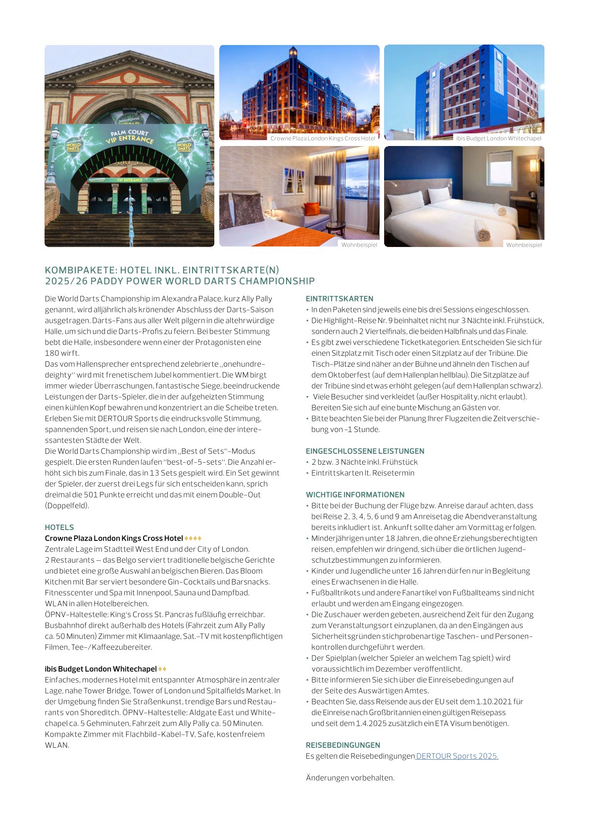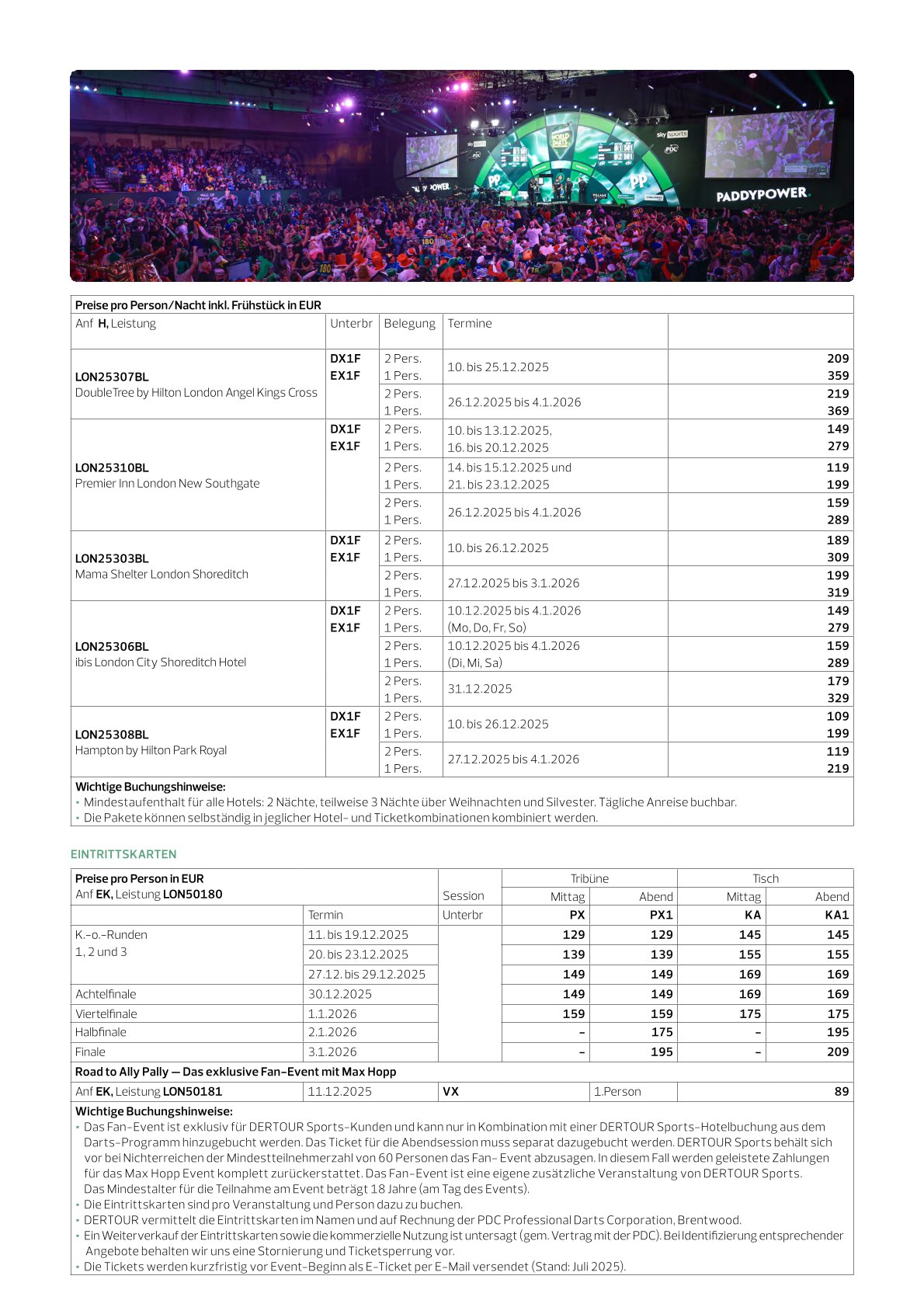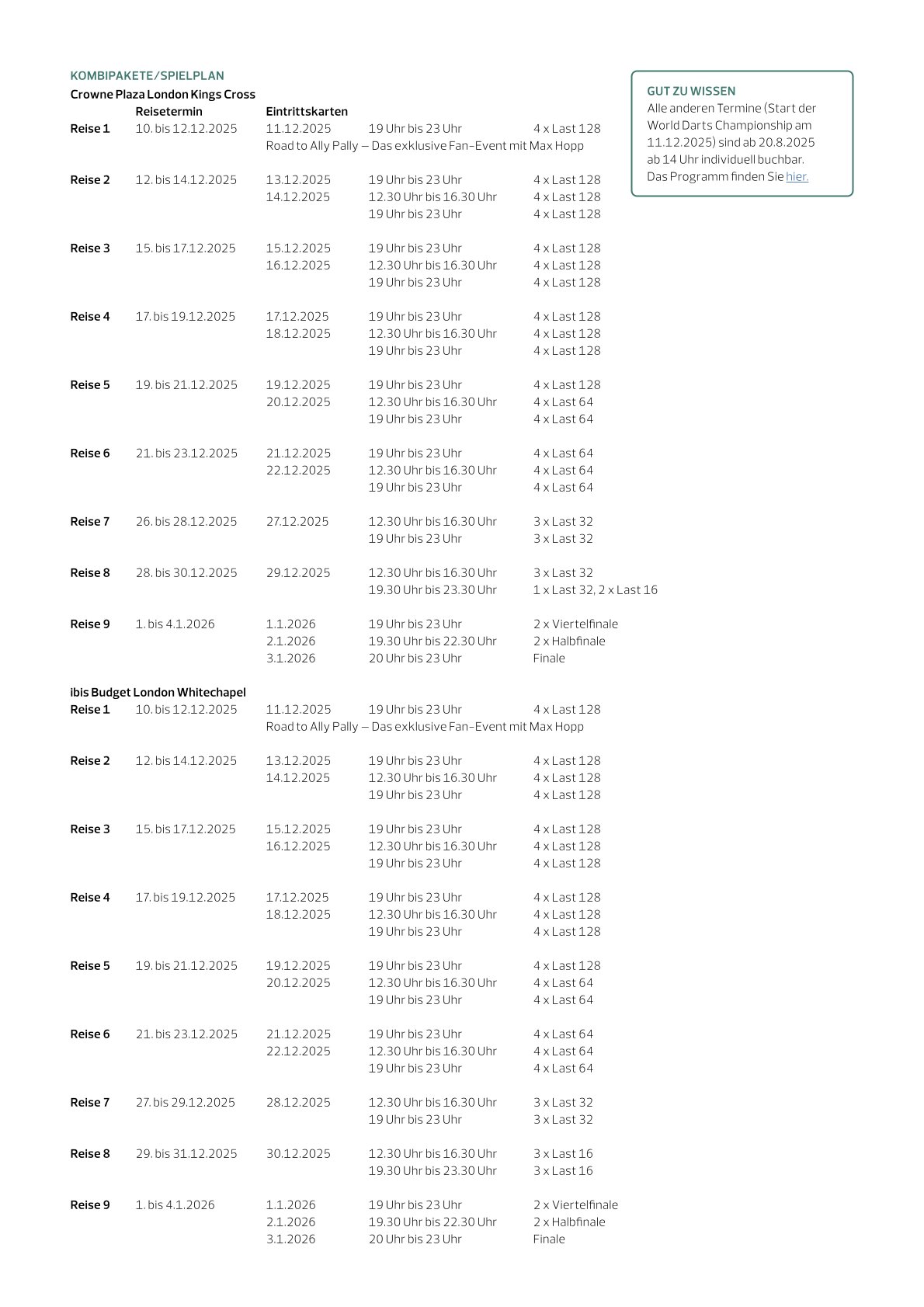 "Ally Pally" (Alexandra Palace) statt. Die Besten der Besten treten gegeneinander an und bringen die Halle zum toben. Darts Fans aus der ganzen Welt lassen sich dieses Spektakel nicht entgehen. Es ist der krönende Abschluss der Darts-Saison und bei bester Stimmung bebt die Halle bei jedem Spiel, besonders wenn die Könner eine 180 werfen.